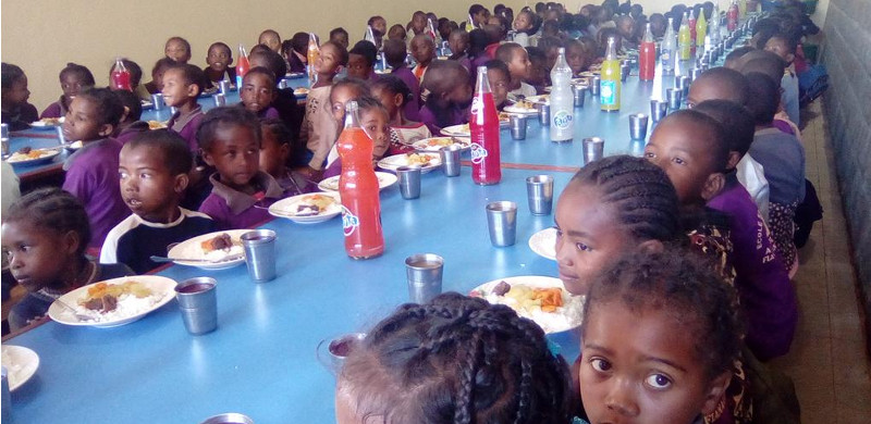 Stołówka szkolna w sierocińcu Siostr Baptystynek. Uczniowie w stołówcce